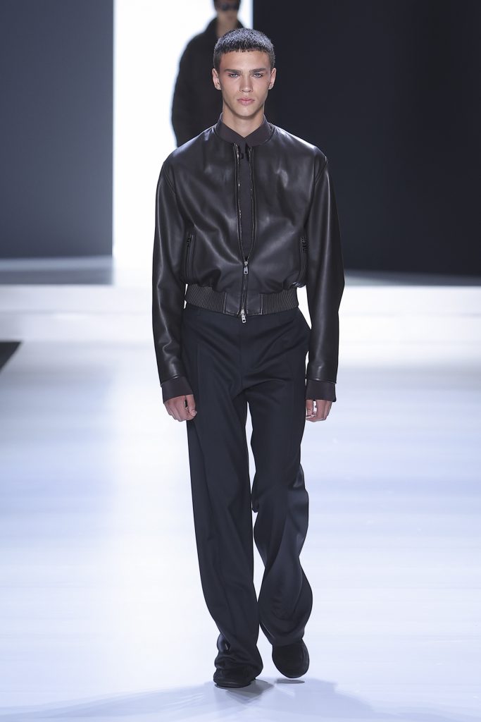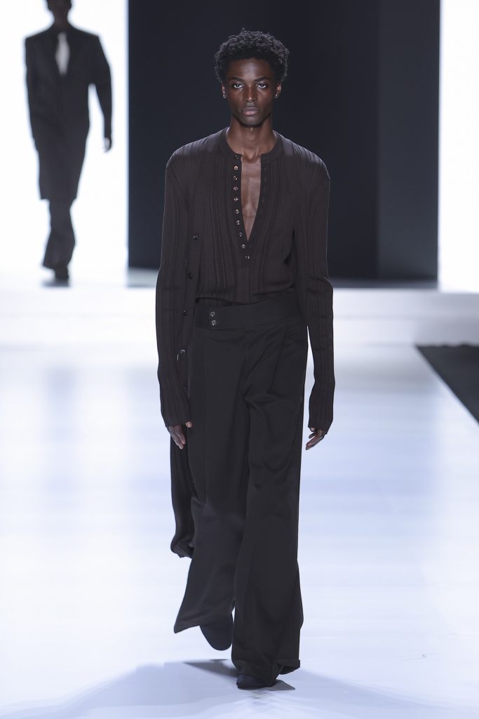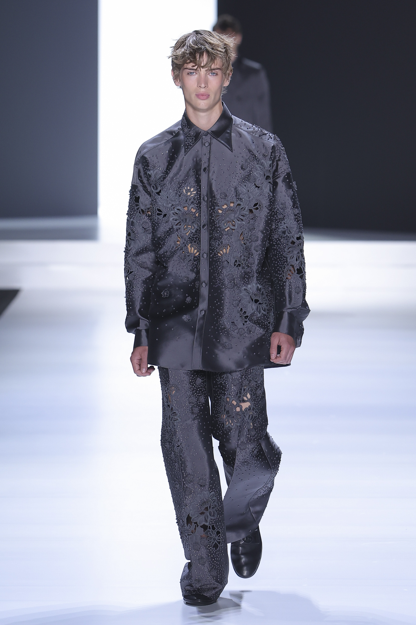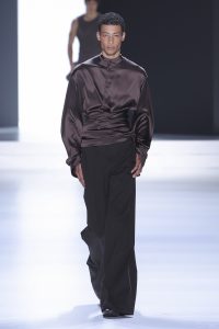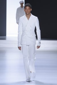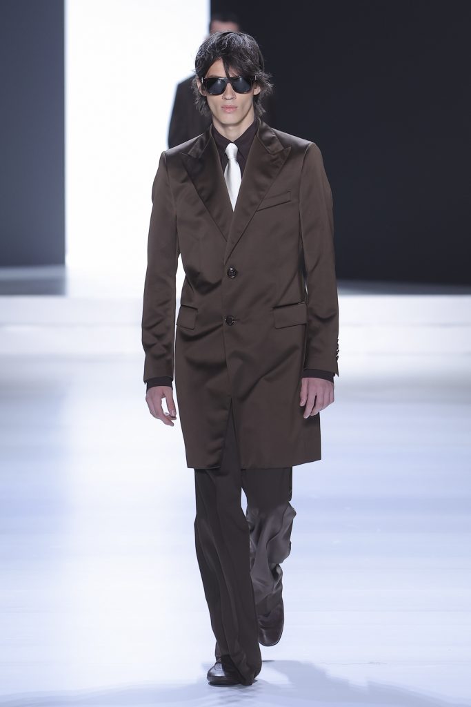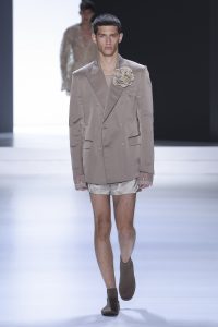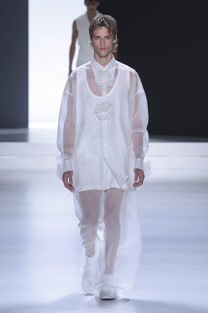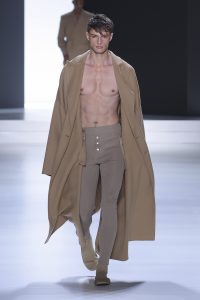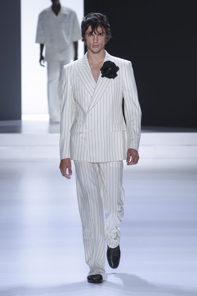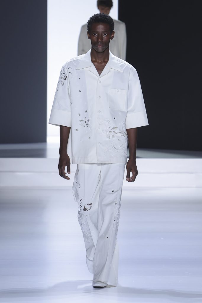 The collection is a succession of color blocks, pure/ethereal white, milk white, sand beige, camel, dark brown, pearl, stone gray ending with absolute Sicily black. Embroidery and materials, wools of “Piacenza” that allow thanks to the inherent characteristics of the material itself, to build garments with structured volumes; suits and jackets thus take a new shape and life as true sculptural works and enhance the male body. Over coats in double cashmere, silk crepe, 3D effect embossed jersey and embroidered silk organza.