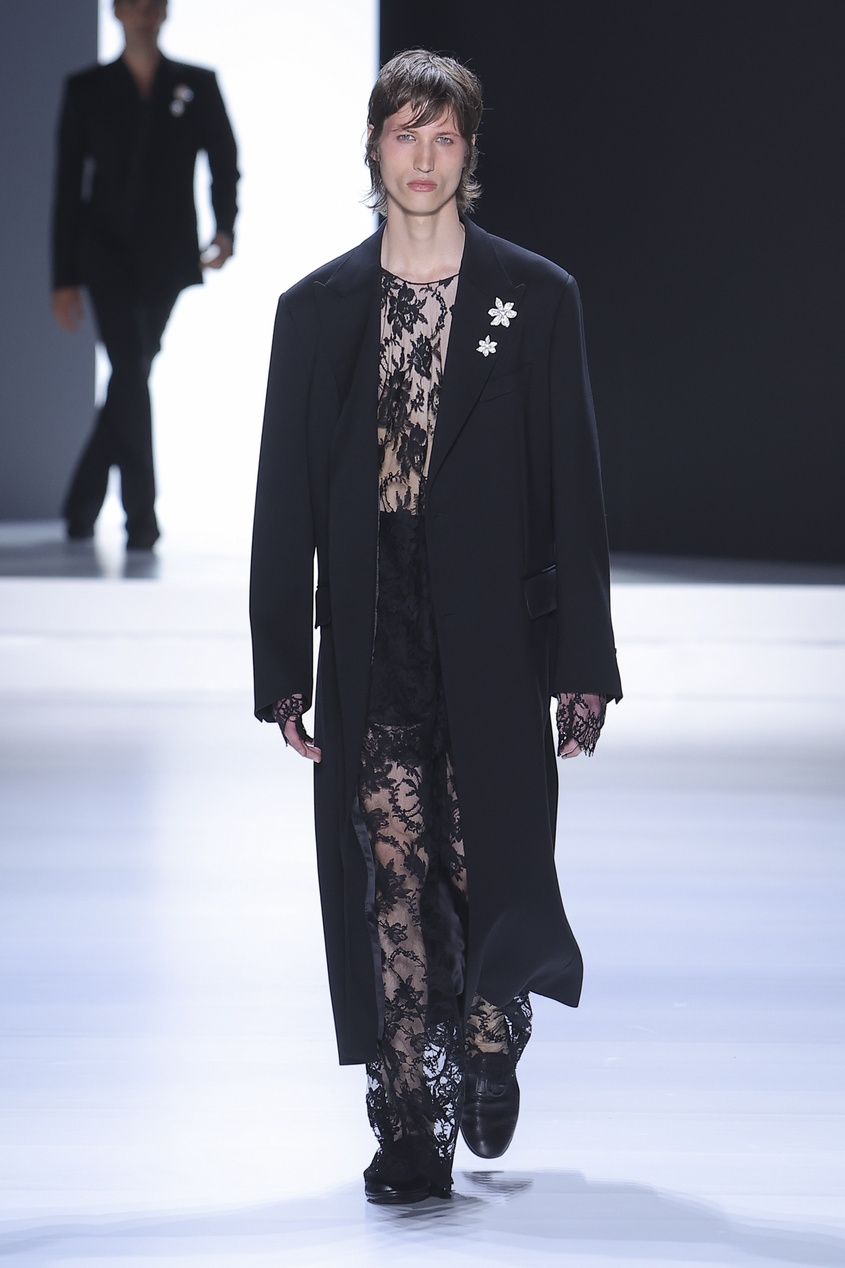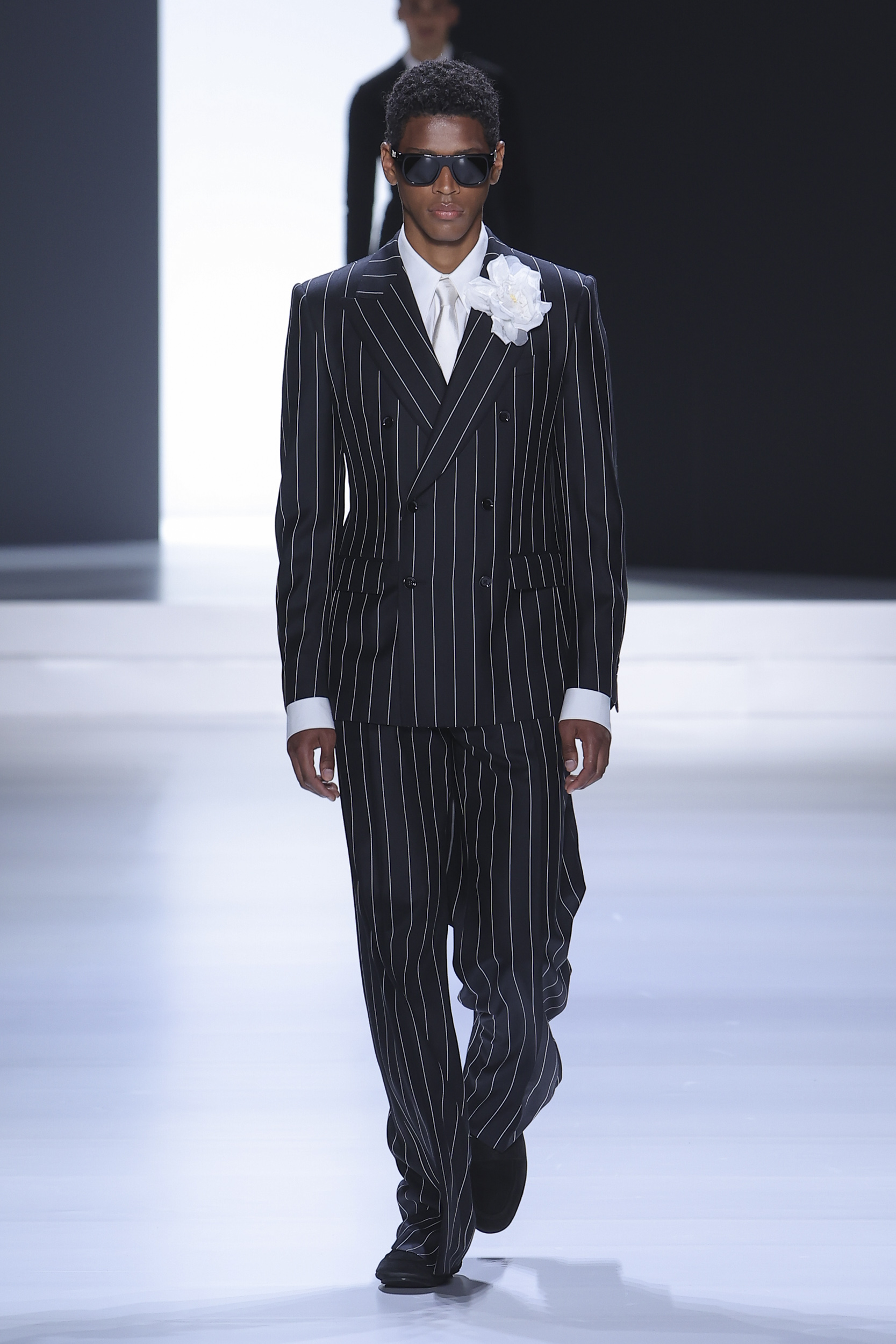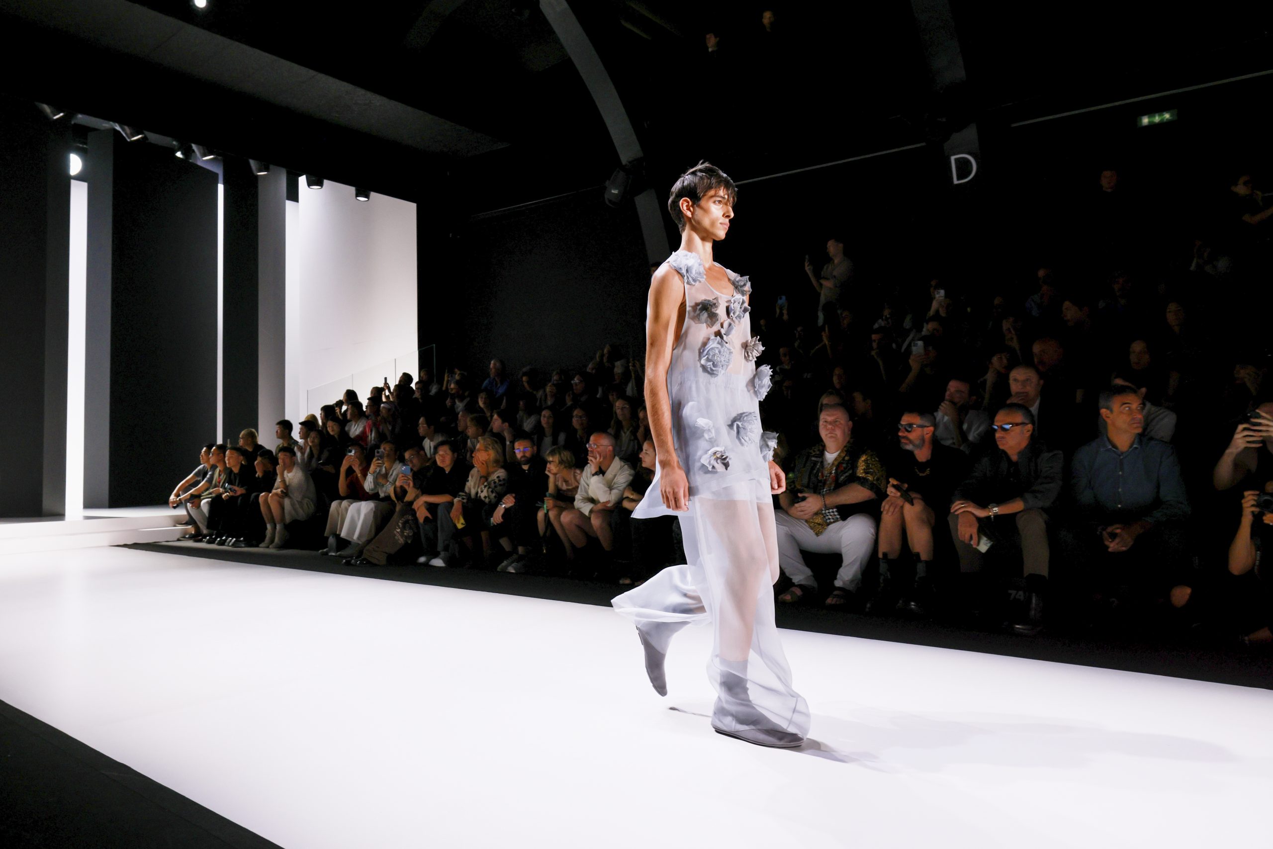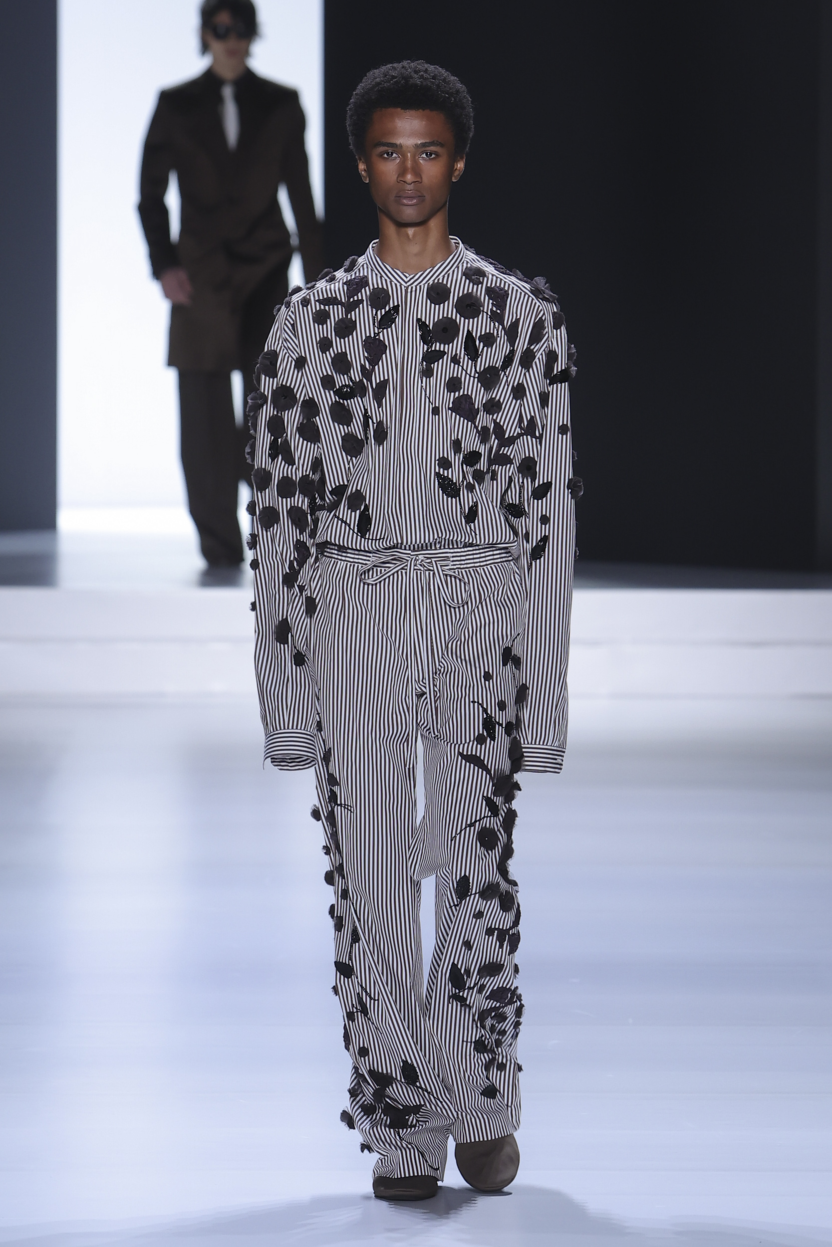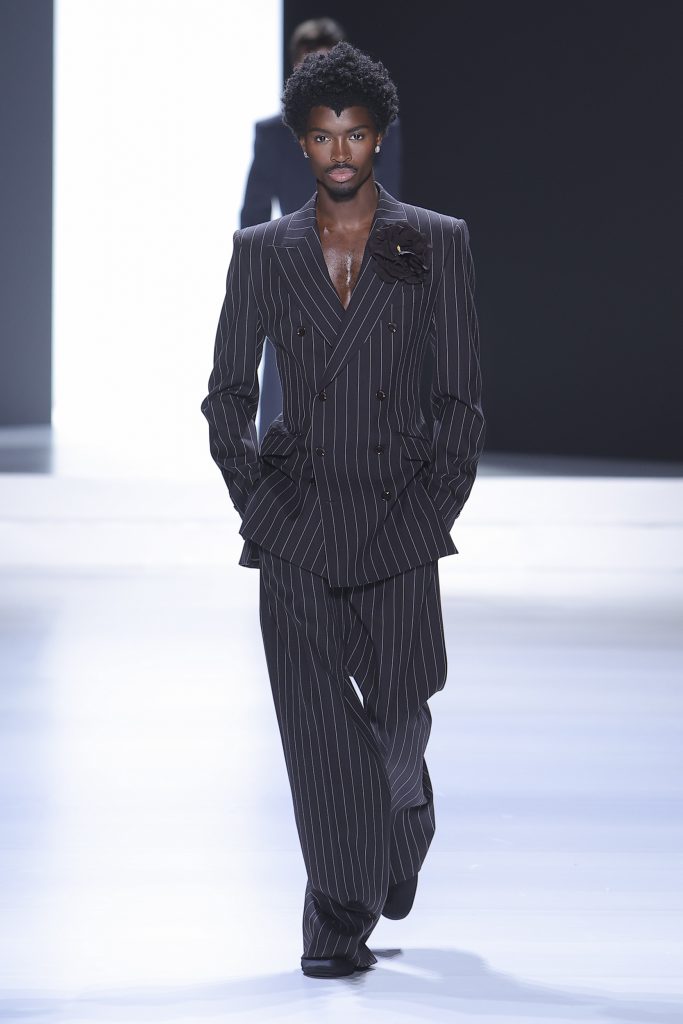 The collection is a succession of color blocks, pure/ethereal white, milk white, sand beige, camel, dark brown, pearl, stone gray ending with absolute Sicily black. Embroidery and materials, wools of “Piacenza” that allow thanks to the inherent characteristics of the material itself, to build garments with structured volumes; suits and jackets thus take a new shape and life as true sculptural works and enhance the male body. Over coats in double cashmere, silk crepe, 3D effect embossed jersey and embroidered silk organza.