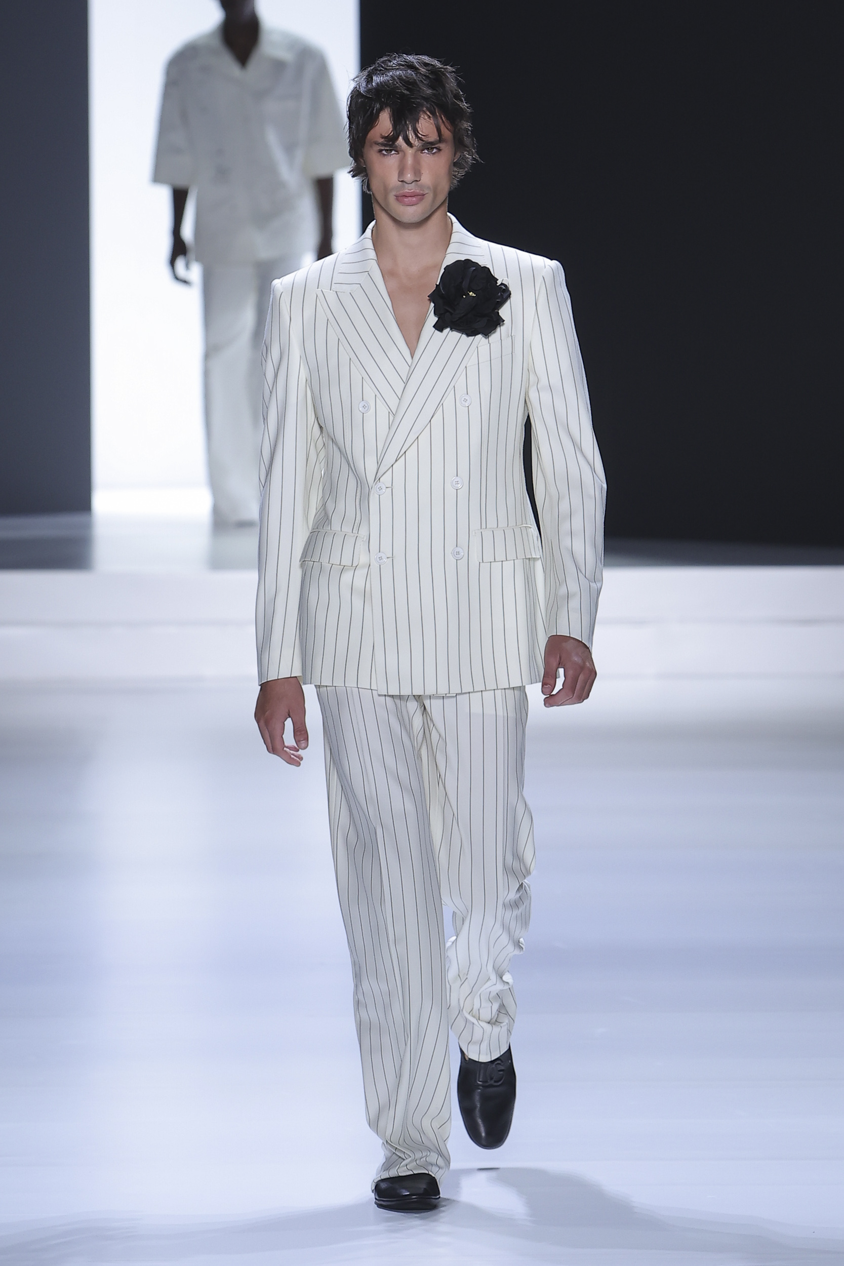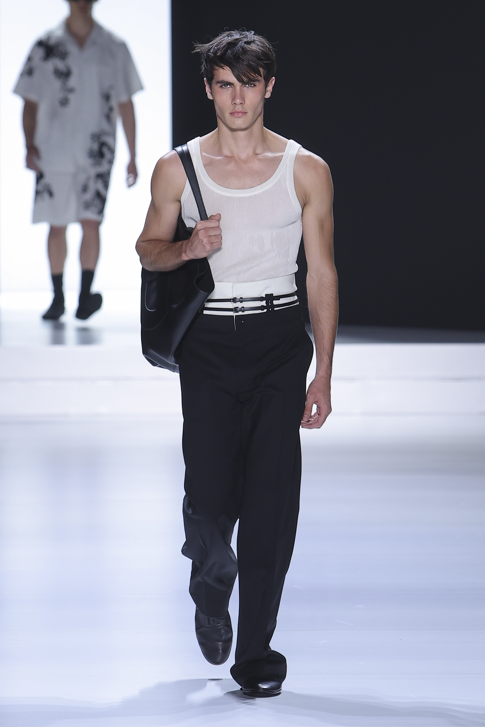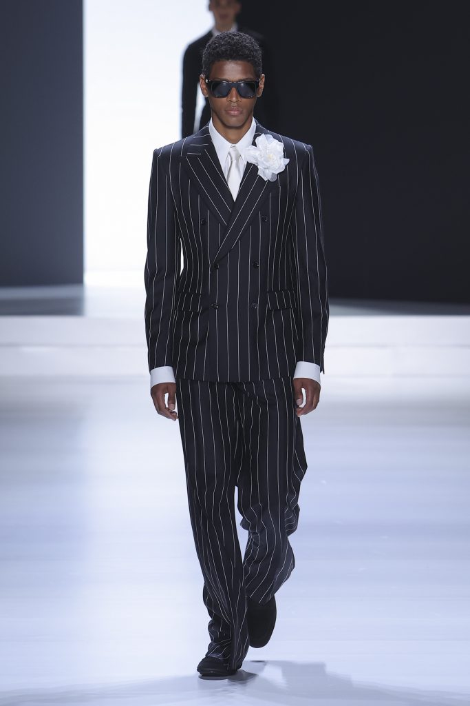 Underwear – tank top and pants made of jersey – complements underwear in silk smocked knitwear. Another novelty is the concept of padded and gathered made with special processing. Silk crepe is completely curled at the seams, padded, almost as if draped over the body while retaining the impalpability of the precious fabric. Sicilia and Taormina jackets stretch to 120 cm become small coats. Suits in double-breasted double duchesse paired with short shorts with an ironed crease. Dolce jacket is proposed in single and double-breasted combined with pants 28cm wide bottom to 45 cm, great novelty of the show, the cargo model proposed in the washed version is presented with the same bottom. Pants with special details “loops” in the belt that echo the details of the vest that allow a glimpse of the body. Prints are replaced by the concept of materiality. Designers work with surfaces, textures, overlays, shades of color, but also on the brightness of the material themselves. The desire for rigor to emphasize the original codes, cornerstones of the brand, in this layering “Style” tells us so.