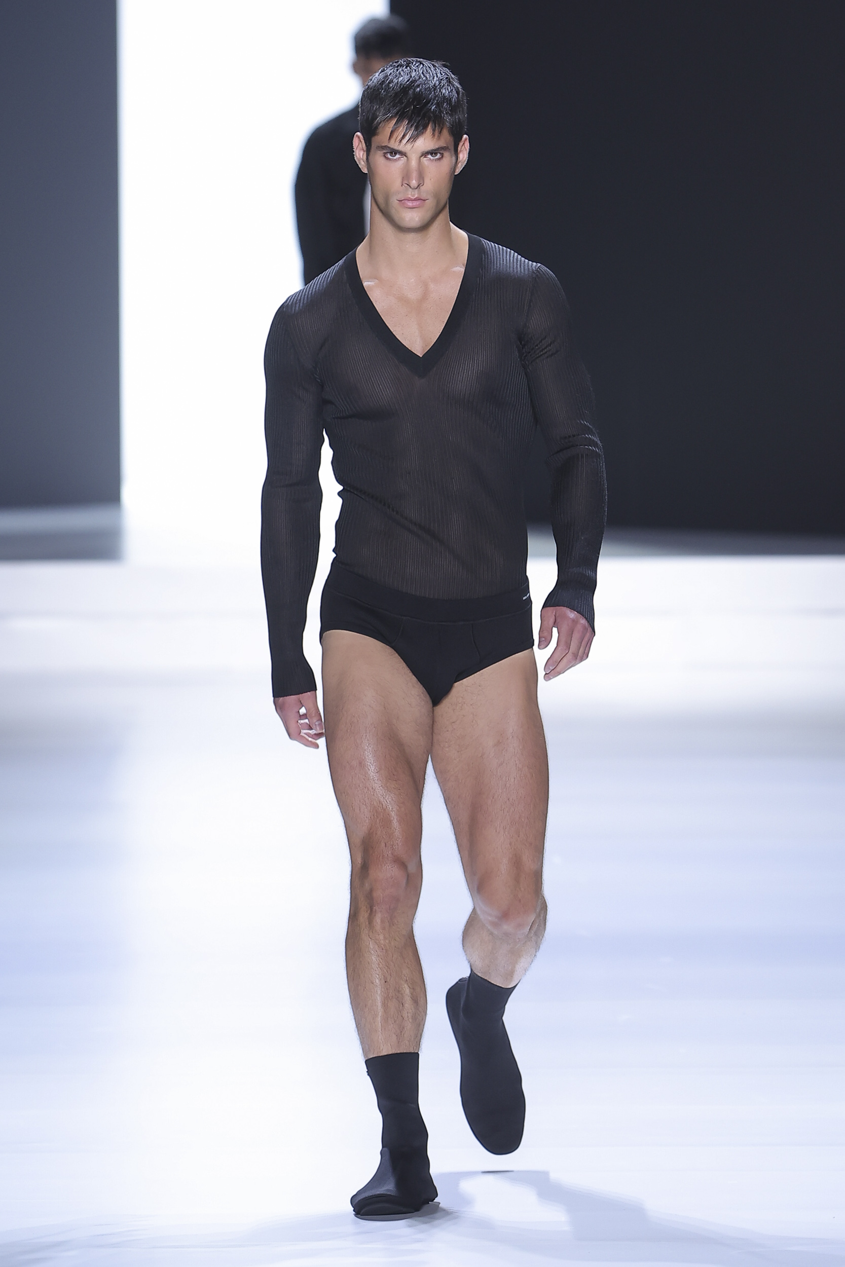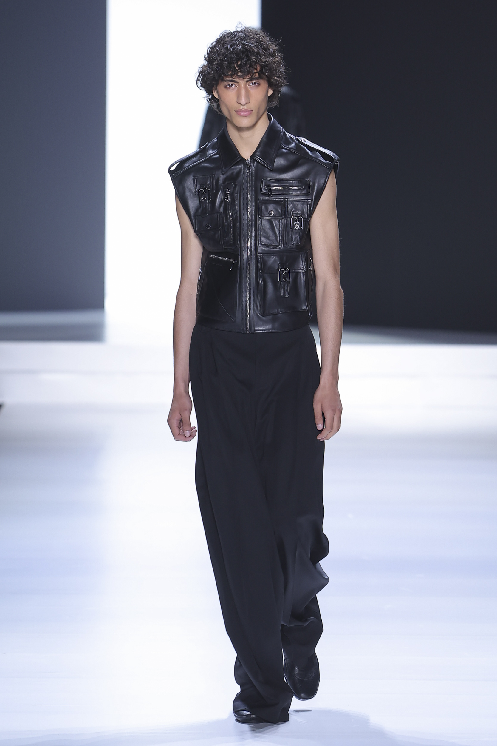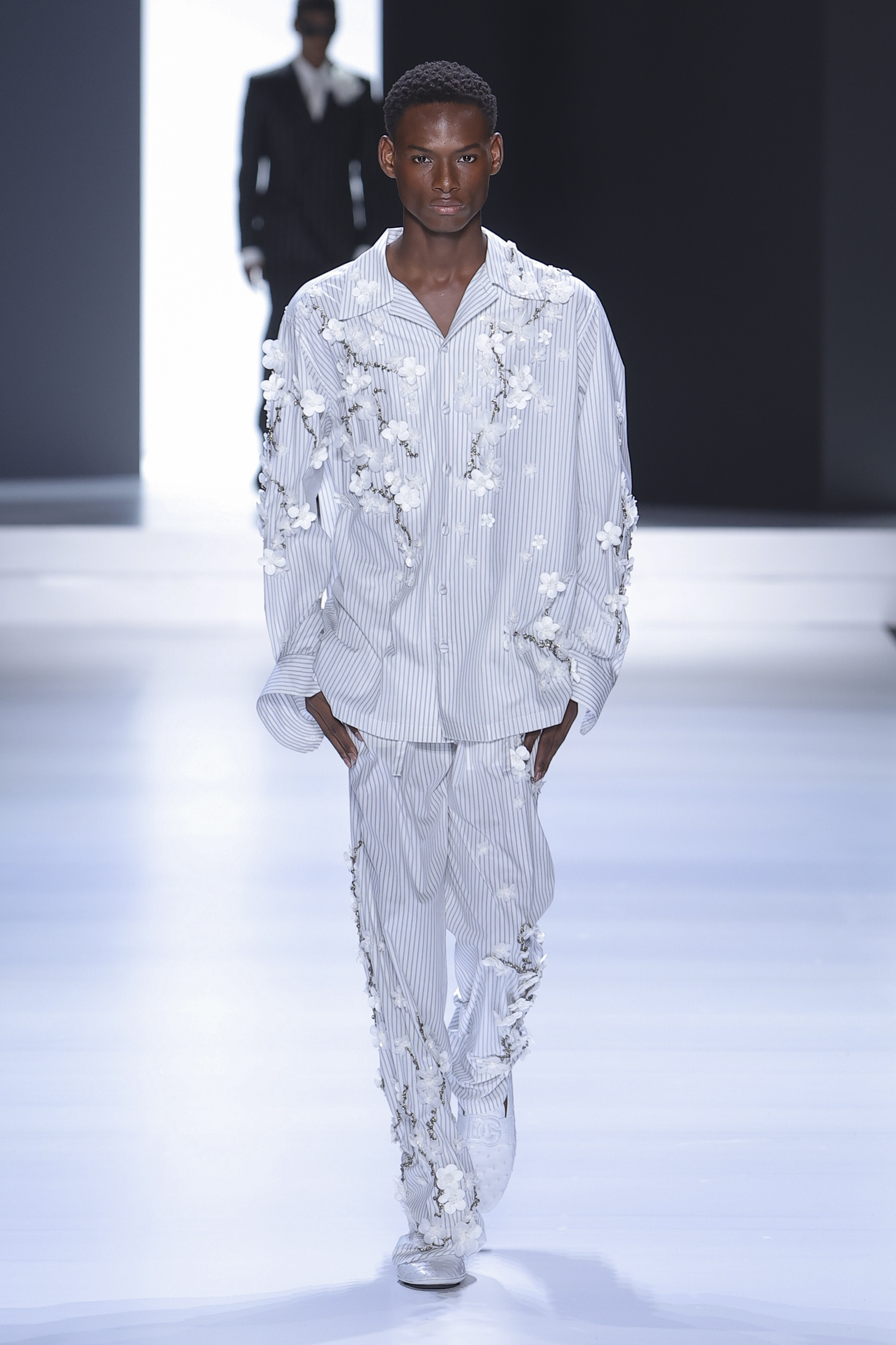 Underwear – tank top and pants made of jersey – complements underwear in silk smocked knitwear. Another novelty is the concept of padded and gathered made with special processing. Silk crepe is completely curled at the seams, padded, almost as if draped over the body while retaining the impalpability of the precious fabric. Sicilia and Taormina jackets stretch to 120 cm become small coats. Suits in double-breasted double duchesse paired with short shorts with an ironed crease. Dolce jacket is proposed in single and double-breasted combined with pants 28cm wide bottom to 45 cm, great novelty of the show, the cargo model proposed in the washed version is presented with the same bottom. Pants with special details “loops” in the belt that echo the details of the vest that allow a glimpse of the body. Prints are replaced by the concept of materiality. Designers work with surfaces, textures, overlays, shades of color, but also on the brightness of the material themselves. The desire for rigor to emphasize the original codes, cornerstones of the brand, in this layering “Style” tells us so.