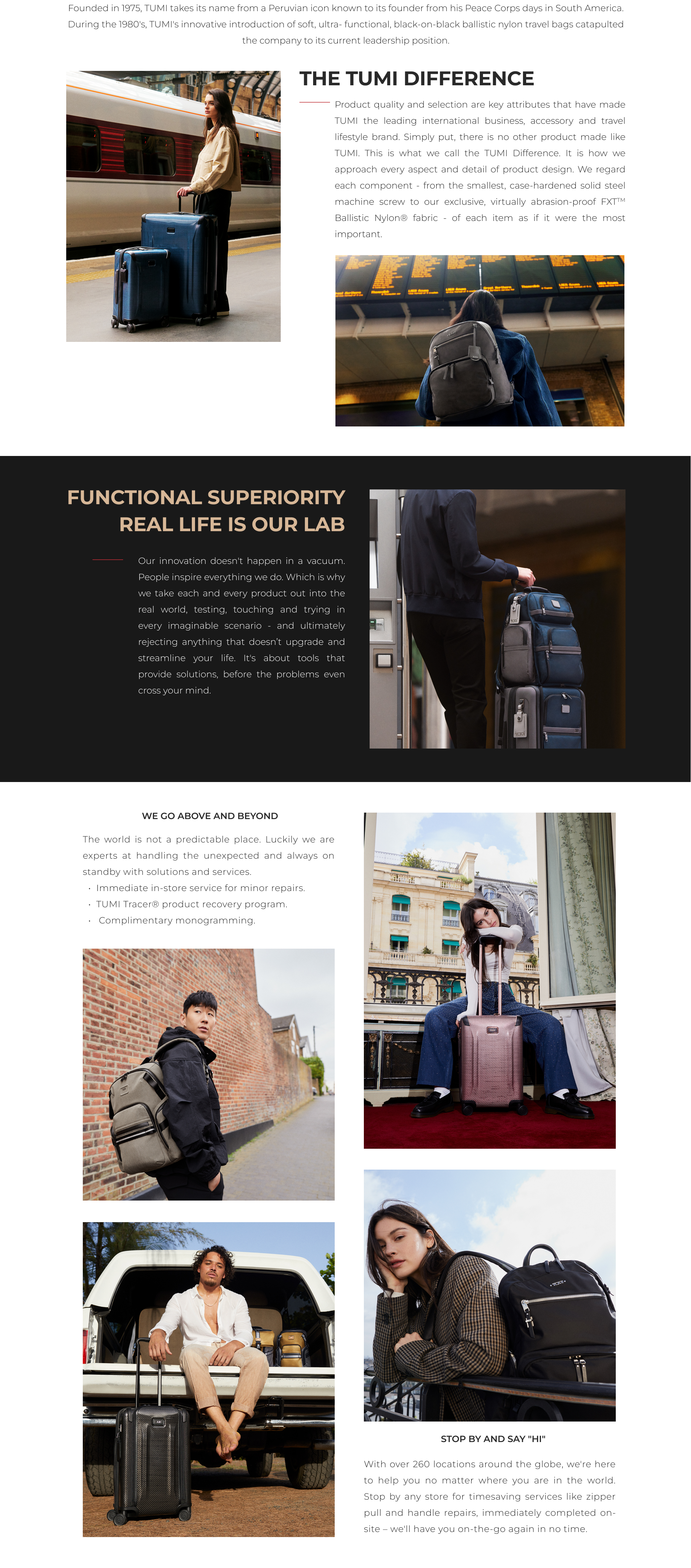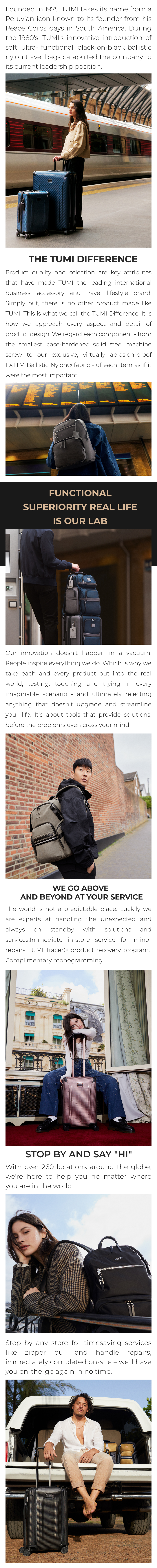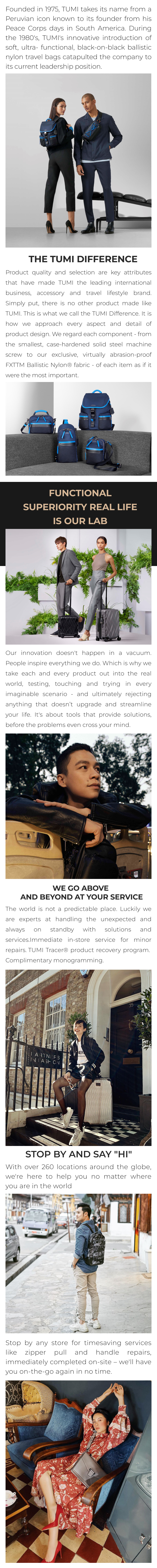 Product quality and selection are key attributes that have made TUMI the leading international business, accessory and travel lifestyle brand. Simply put, there is no other product made like TUMI. This is what we call the TUMI Difference. It is how we approach every aspect and detail of product design. We regard each component - from the smallest, case-hardened solid steel machine screw to our exclusive, virtually abrasion-proof FXTTM Ballistic Nylon® fabric - of each item as if it were the most important.